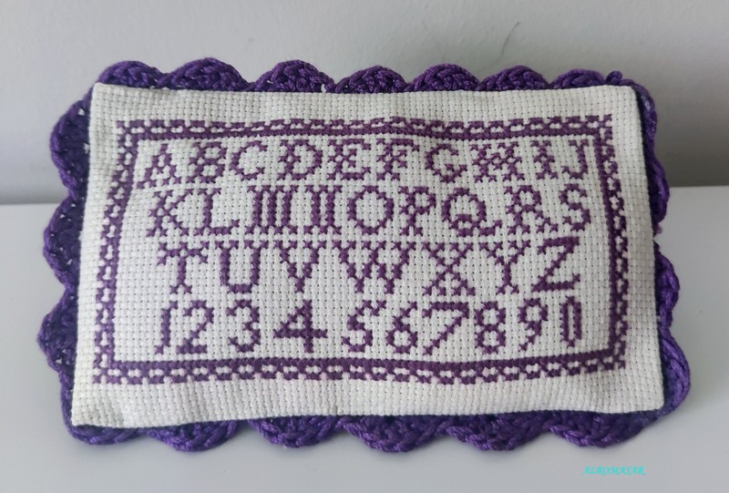 Wow! Your cross stitching is so tiny and awesome! You are very talented! Love the purple choice and the crochet all around!